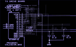 Collision avoidance is accomplished with 2 more Polaroid ultrasonic ranging sensors which are mounted under the front of the robot. Facing forward at 40 degrees of center to the left and right, these sensors detect objects in front of the robot as it moves forward. A Basic Stamp reads the distance information from each sensor and determines if it is within a pre-determined range (about 2 feet in front of the robot). A signal is sent to the DRIVE CONTROL if an object is sensed within this range.